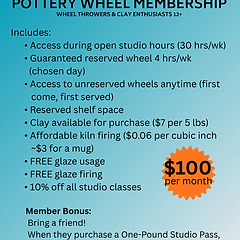 Includes access to everything in the studio plus: -Guaranteed Speedball pottery wheel during your reserved membership time -Use of UN-RESERVED pottery wheels during all other open times -Reserved shelf space -Affordable kiln bisque firing ($0.06 per cubic inch) -FREE glaze usage -FREE glaze firing -10% off studio classes -Member bonus: Bring a friend! When they purchase a One-Pound Studio Pass $25 you get 5 lbs clay FREE (1x per month)